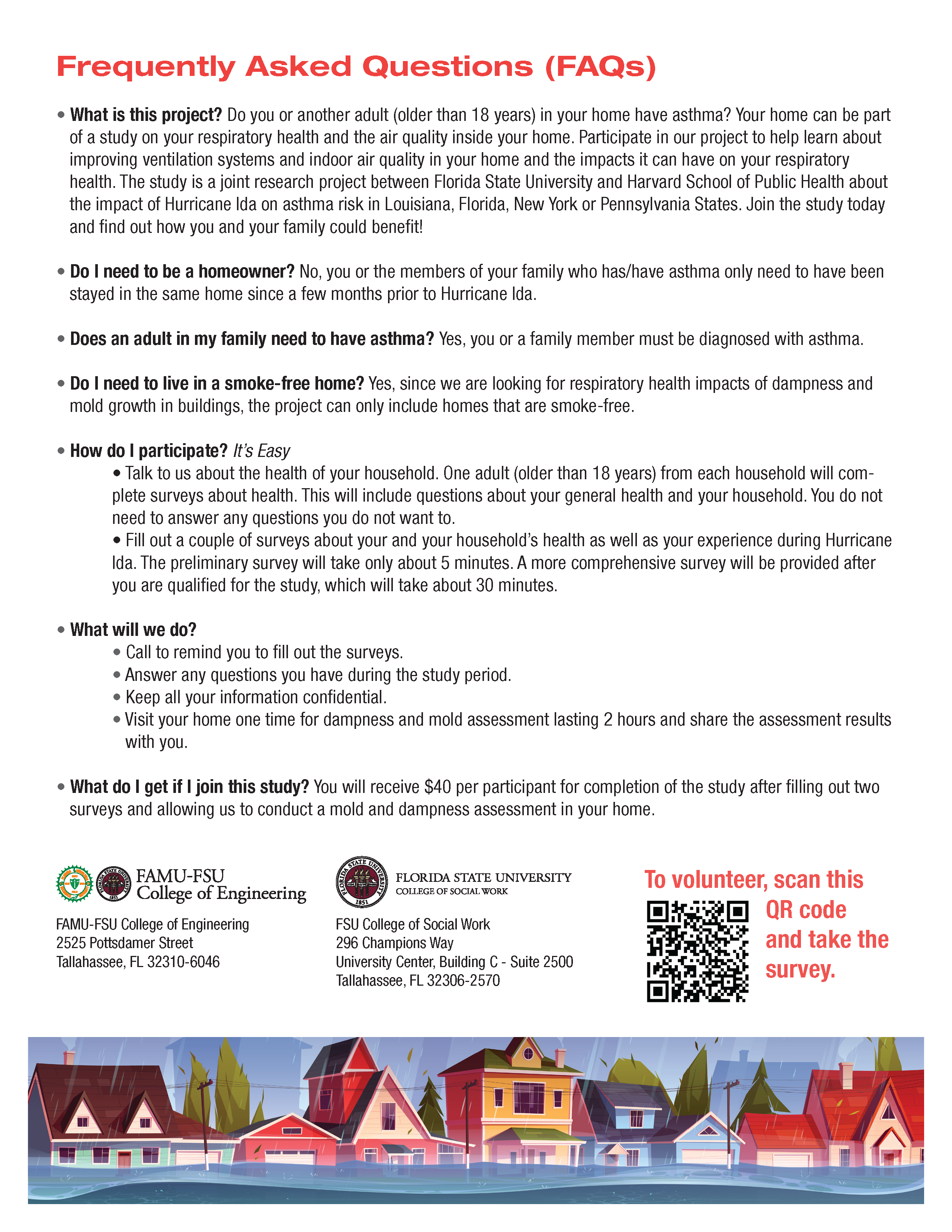 If your answers to these questions are yes, you may qualify to participate in a new study being conducted jointly by the FAMU-FSU College of Engineering and the Harvard T.H. Chan School of Public Health. Your insight will help researchers determine links between water damage, mold growth, and health status.